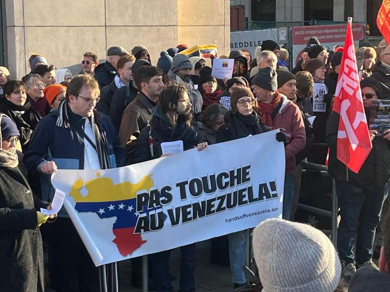 Le week-end dernier, deux manifestations ont été organisées à Bruxelles pour exprimer la solidarité envers le peuple vénézuélien et protester contre l'agression impérialiste des États-Unis. La première a eu lieu le samedi 3 janvier, quelques heures après l'annonce du bombardement du Venezuela par l'armée américaine, qui a tué des dizaines de militaires et de civils, et permis l’enlèvement de Nicolas Maduro, un chef d'État en exercice. Organisée depuis les réseaux sociaux par différents groupes de solidarité, elle a rassemblé environ 200 personnes devant l'ambassade du Venezuela. Notre campagne “Hands Off Venezuela”/”Pas touche au Venezuela” était présente. À cette occasion, un appel à une action plus importante a été lancé par Vrede, CNAPD et Intal pour le lendemain devant l'ambassade des États-Unis.