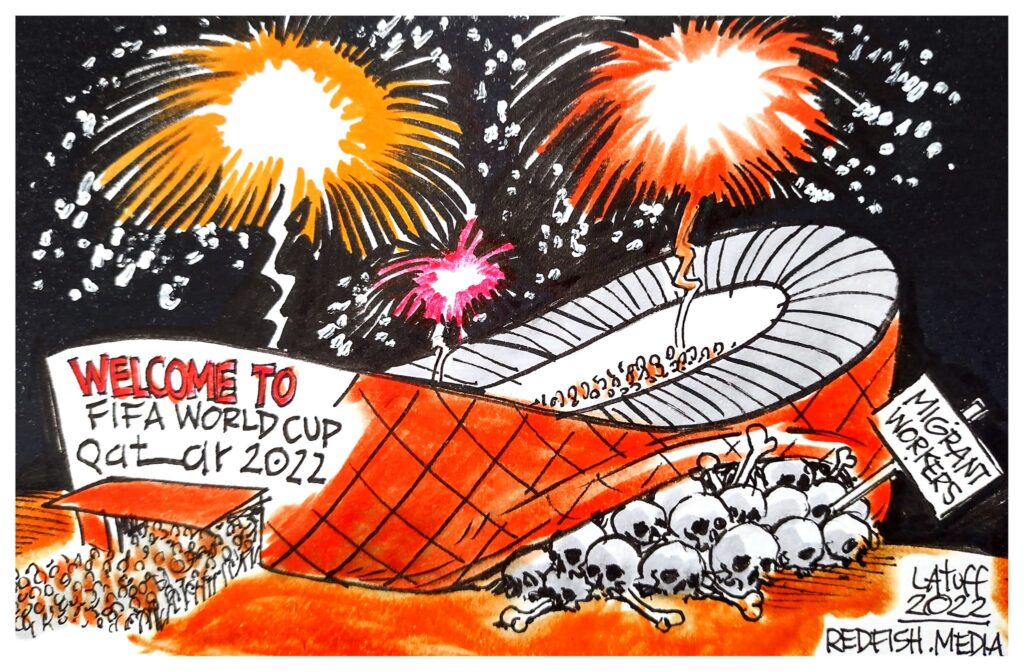 Tout en faisant la promotion de la « neutralité » du football et de la paix dans le monde, les dirigeants de la FIFA ont fermé les yeux sur ce que nous venons de décrire. Son président, Gianni Infantino, a déclaré que cette Coupe du monde serait la « meilleure de tous les temps ». Et lorsqu’il fut obligé de répondre à une question portant sur les conditions sociales de sa préparation, voici tout ce qu’il trouva à dire : « les 6 000 personnes pourraient être mortes dans d’autres chantiers ». Elles pourraient aussi ne pas être mortes, mais Gianni Infantino n’y a pas songé, manifestement, et a cru devoir préciser que la FIFA « n’est pas la police du monde, ni responsable de tout ce qui se passe ». Circulez, il n’y a rien à voir !