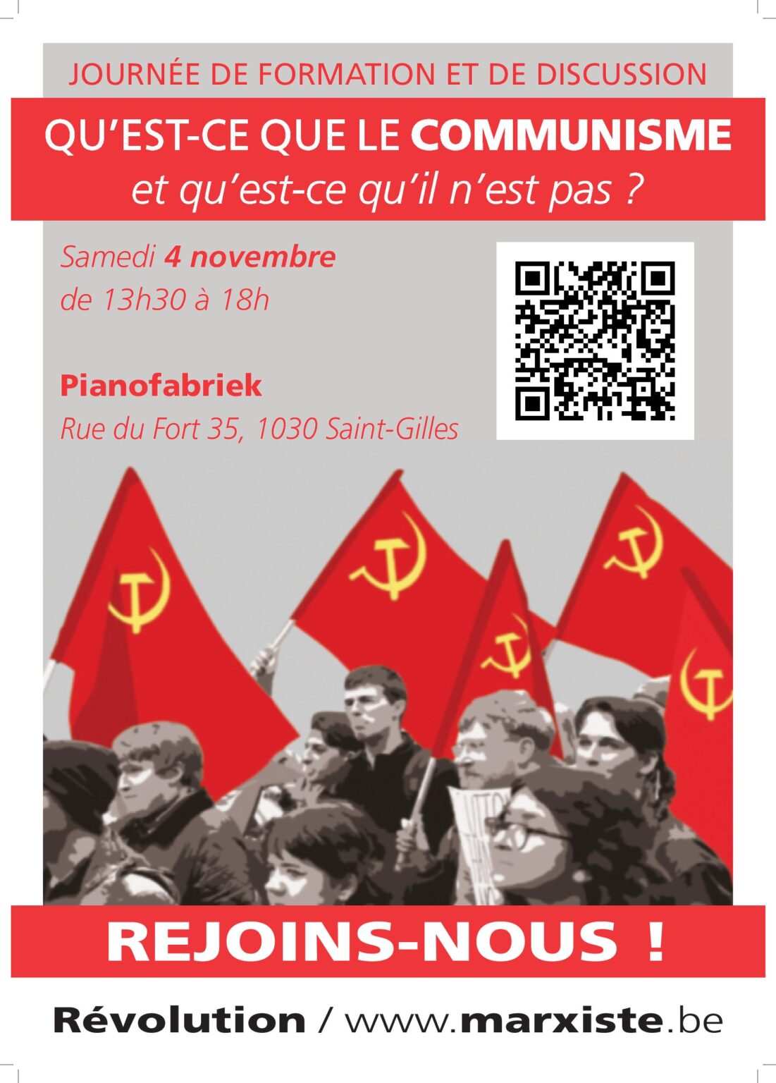 Notre campagne veut leur fournir une organisation révolutionnaire, en Belgique et au niveau international : la Tendance Marxiste Internationale. En effet, un ou une communiste non organisé(e) est une contradiction dans les termes. Mais vous pouvez facilement surmonter cette contradiction en nous rejoignant… Si vous voulez savoir pourquoi nous sommes communistes, lisez cet article. Si vous voulez nous rejoindre, scannez rapidement notre code QR sur l’affiche ci-dessous. Venez également à notre journée de formation et de discussion le samedi 4 novembre à Bruxelles. Ensemble, nous discuterons de ce qu’est le communisme et de ce qu’il n’est pas.