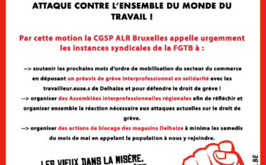 Nous vous proposons la motion de la CGSP-ALR Bruxelles au sujet de l'inspirante lutte des travailleurs de Delhaize. Entretemps le front commun syndical interprofessionnelle à annoncé une manifestation nationale